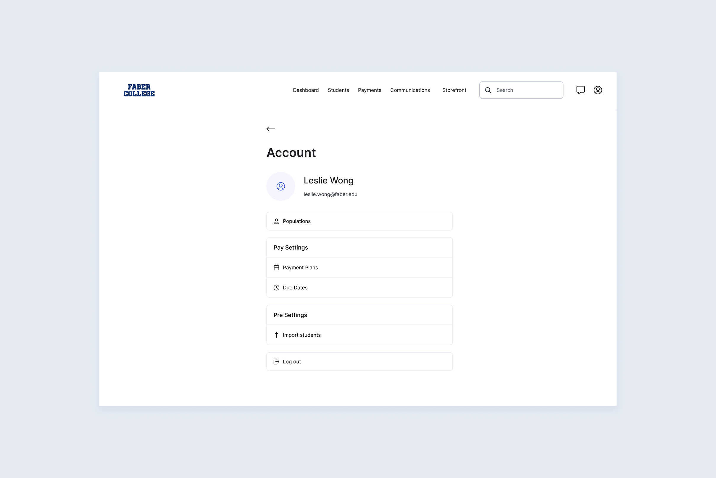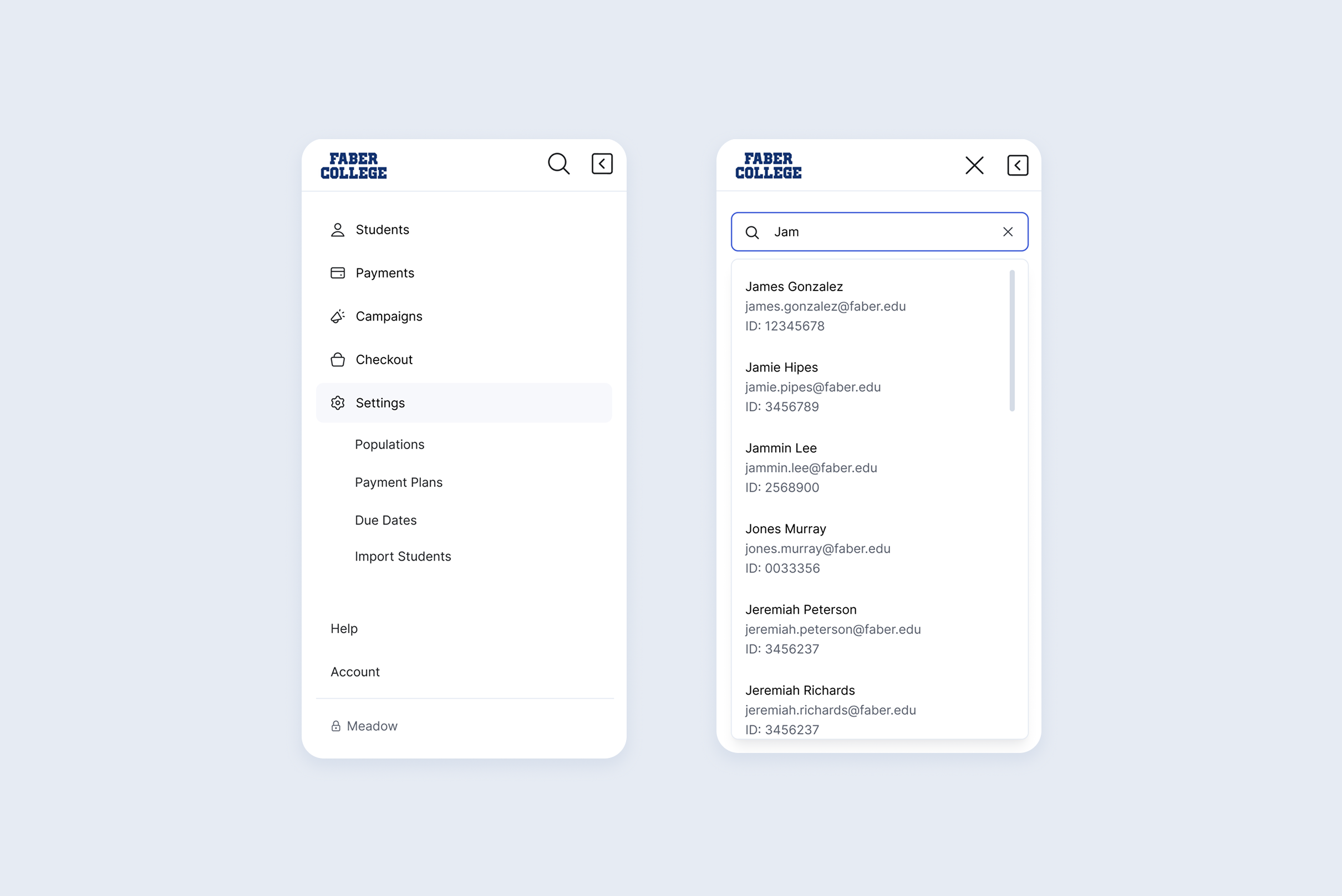 The new structure defined five top-level sections — Students, Payments, Campaigns, Checkout, and Settings — each expandable to reveal nested sub-pages. Utility links pinned to the bottom keep the primary nav clean. The pattern deliberately mirrors standard B2B SaaS conventions to reduce the learning curve.